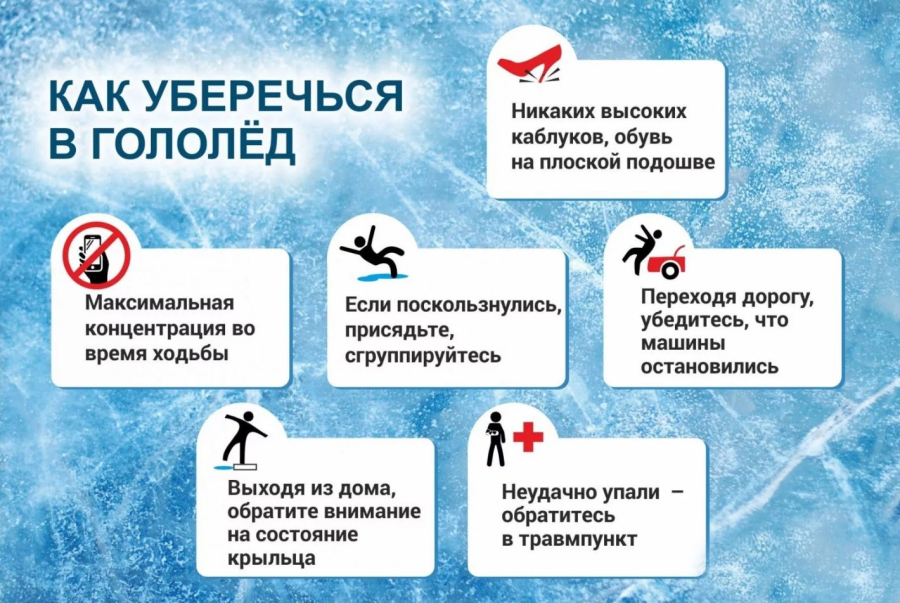 Внимание: Смотрите под ноги, избегайте участков с наледью, выбирайте посыпанные песком дорожки.
