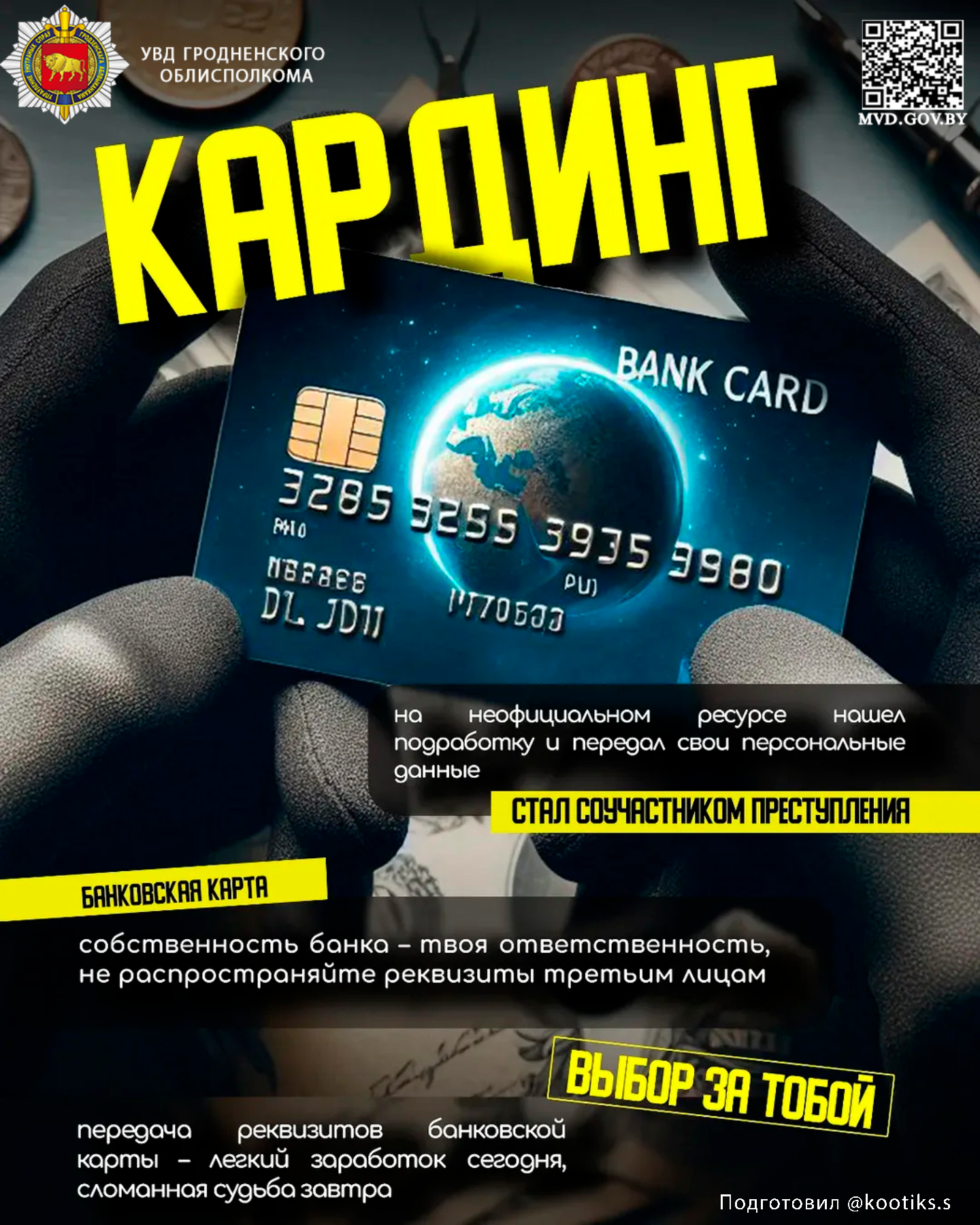 и убеждают по ссылке из мессенджера скачать фейковое приложение, чтобы продлить услугу. Такие приложения дают возможность мошенникам видеть всю информацию с экрана смартфона (коды из смс, логины и пароли к банкингу). Надо знать, что безопасно скачивать приложения только из официальных магазинов «Google Play», «App Store», «App Gallery», а не по направленным ссылкам. - Сообщают о возникшей проблеме и, войдя в доверие, предлагают помощь в ее решении. Например, жертву ошарашивают подозрением в соучастии в преступлении, следовательно, вероятностью проведения обыска и изъятием денежных средств. Для их сохранения предлагают перевести наличные на якобы защищенный счет или передать якобы работнику банка для декларирования.
